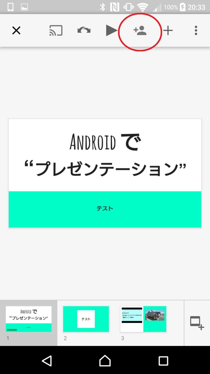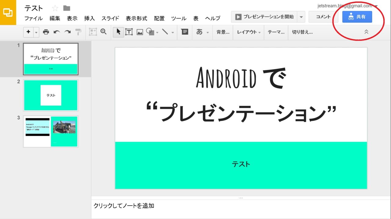 「Google ドライブ」のファイルの “アクセス権” 変更は、「Google ドライブ」から対象のファイルを開き、右上の “共有” アイコンをクリックします。