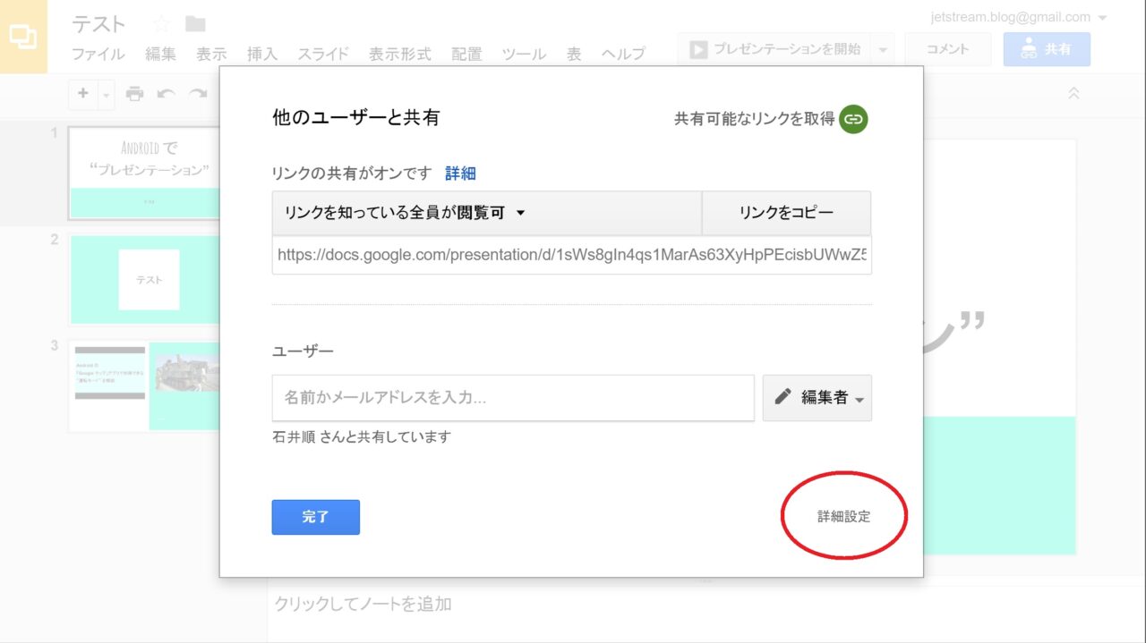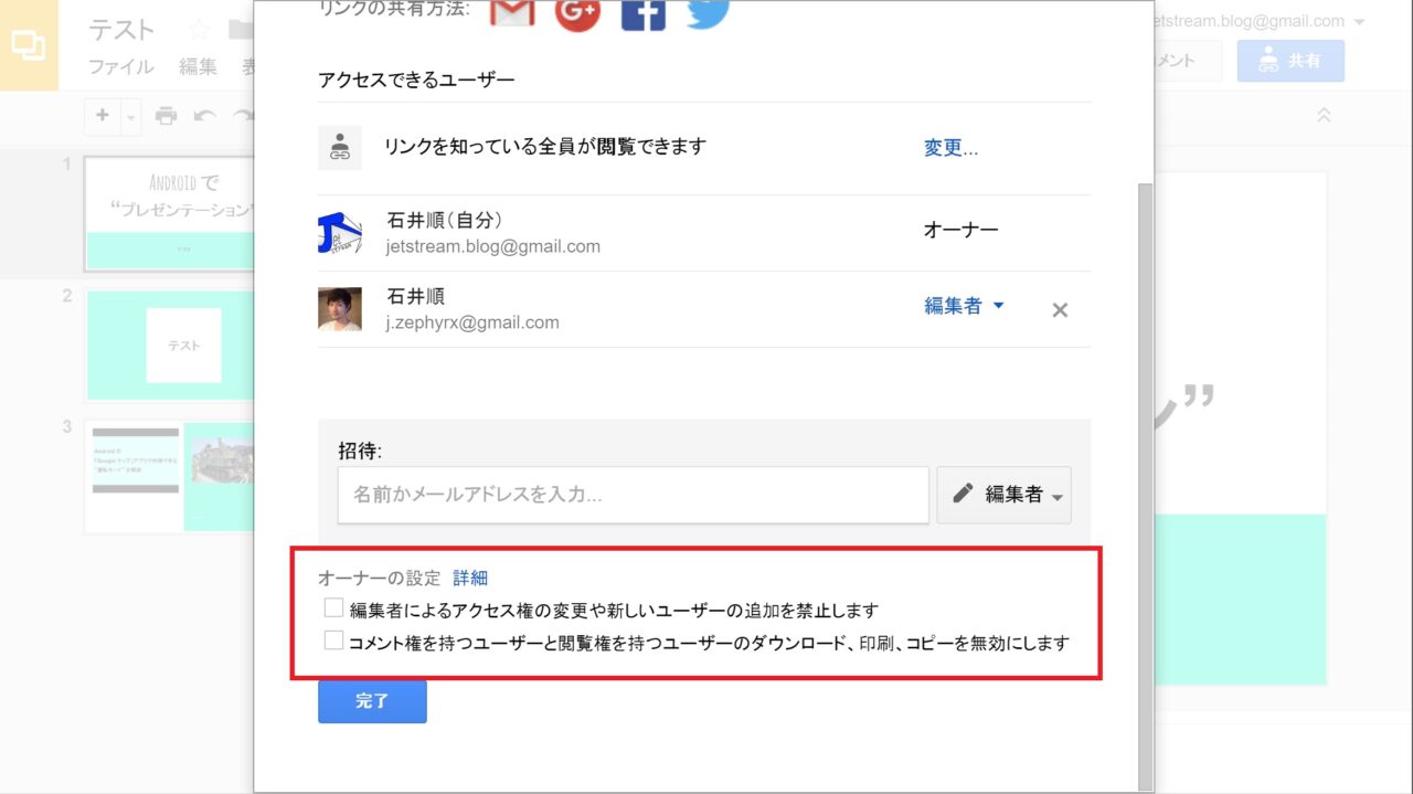 共有時の制限は、“編集者によるアクセス権の変更と新しいユーザーの追加” と “コメント権と回覧権を持つユーザーのファイルダウンロード、印刷、コピー操作” を禁止する設定です。
