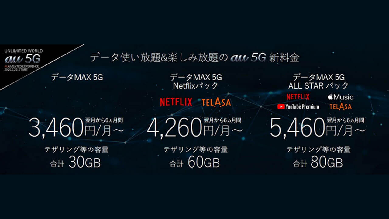 ただし「データ MAX 5G ALL STAR パック」については 6 月以降の提供で、そのほかは 3 月 26 日の「au 5G」開始日からの提供となります。
