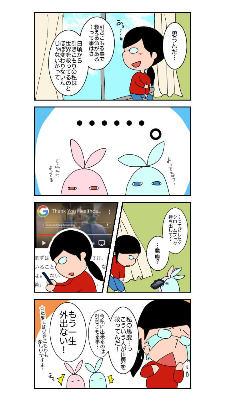 医療崩壊を防ぐことはもちろん、最前線で頑張ってくれている医療従事者の方々に無駄な労力を使わせないためにも、とにかく今は家で引きこもりましょう!