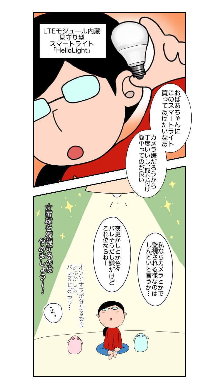 特に「HelloLight」は、eSIM が内蔵されていて単体でモバイル通信を行うことができるので、Wi-Fi などがない環境などでもただ単に電球を交換するだけで見守り出来ちゃう点がポイントなんですよね^^