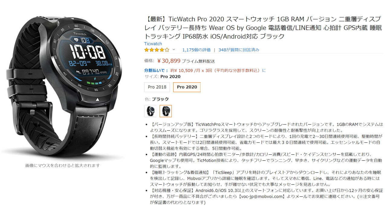 「Ticwatch Pro 2020」の Amazon 価格は 30,899 円で、“ブラック” と “シルバー” の 2 色がラインアップされています。