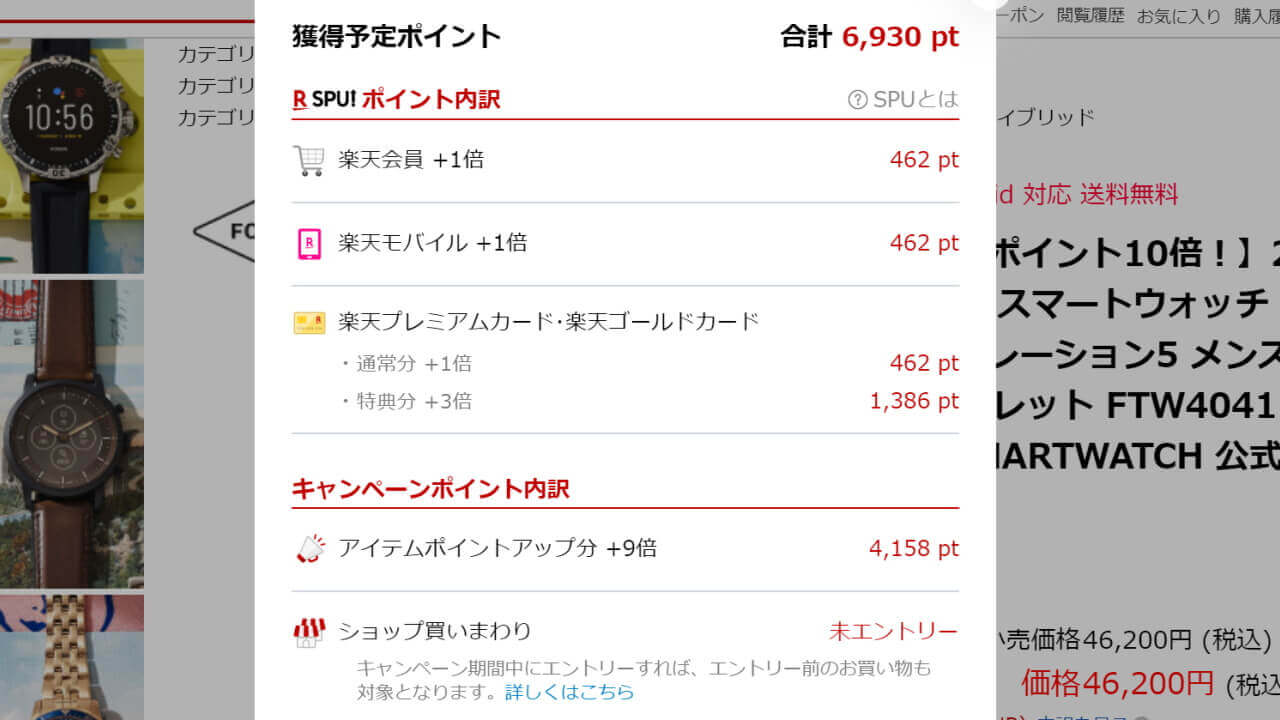 今回の「Fossil 楽天市場公式ストア」における第 5 世代 Wear OS ウォッチのポイント 10 倍は、楽天会員 1 倍 + アイテムポイントアップ 9 倍を合わせて 10 倍。さらに「楽天カード」決済や「楽天モバイル」ユーザーの場合は、ポイントが倍増します。