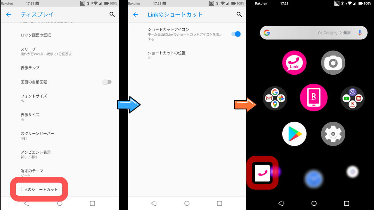 - ホーム画面左右どちらか下に「Rakuten Link」ショートカットを設置可能