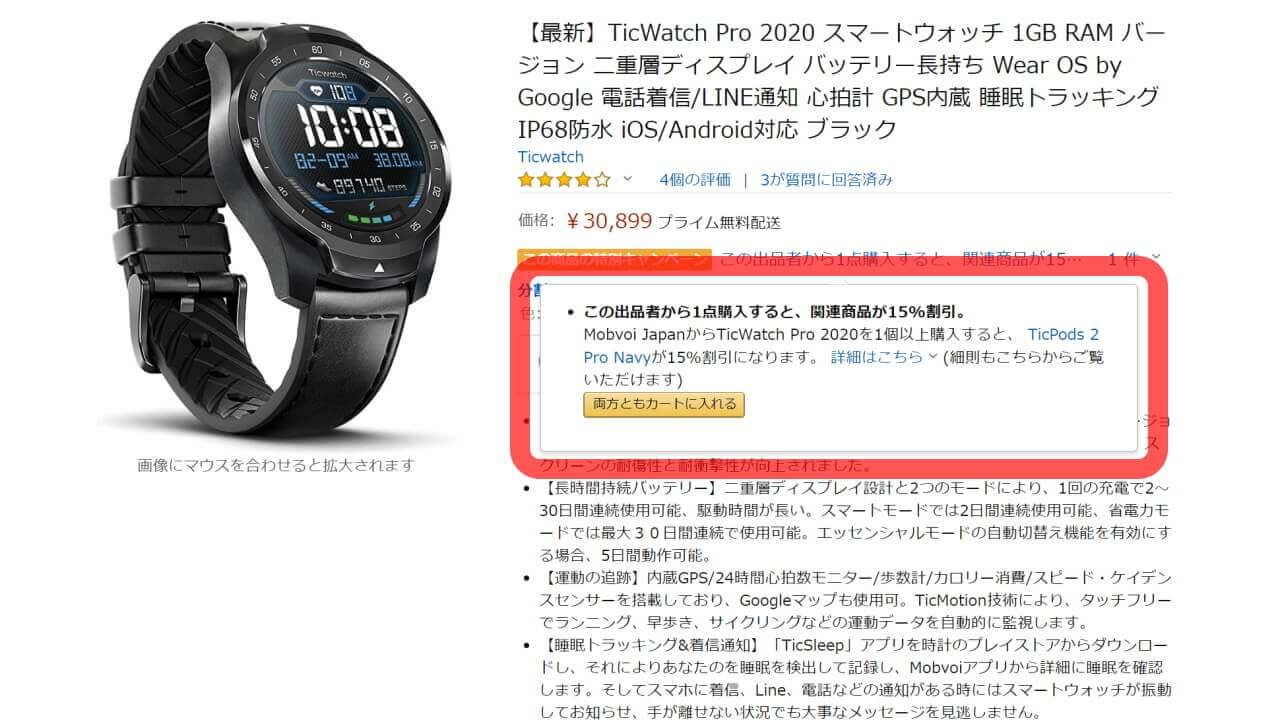 今回の Amazon における特別キャンペーンは、「Ticwatch Pro 2020」はカラーを問いませんが、「TicPods 2 Pro」は “ブルー” 限定です。また同時にカートに入れることで、清算時に「TicPods 2 Pro」15% 引きが適用されます。