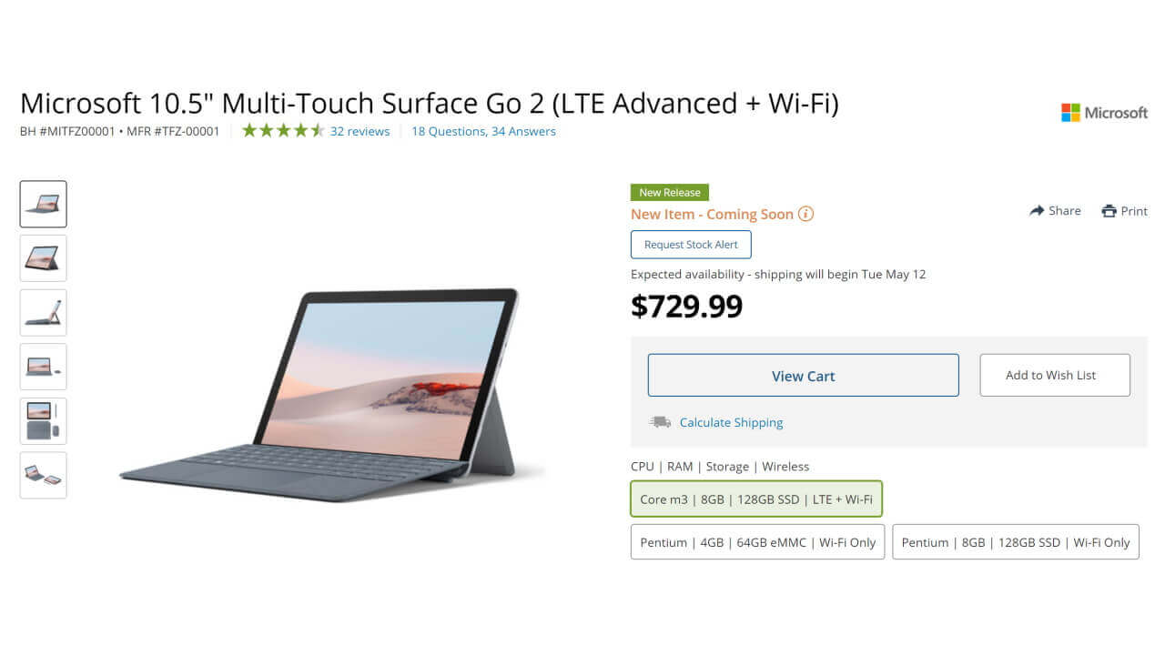 B&H では、Pentium Gold 4425Y プロセッサ + 4GB RAM + 64GB 内部ストレージ搭載 Wi-Fi モデル、Pentium Gold 4425Y プロセッサ + 8GB RAM + 128GB 内部ストレージ搭載 Wi-Fi モデル、第 8 世代 Core m3 プロセッサ + 8GB RAM + 128GB 内部ストレージ搭載 LTE モデルの、計 3 モデルがラインアップされています。