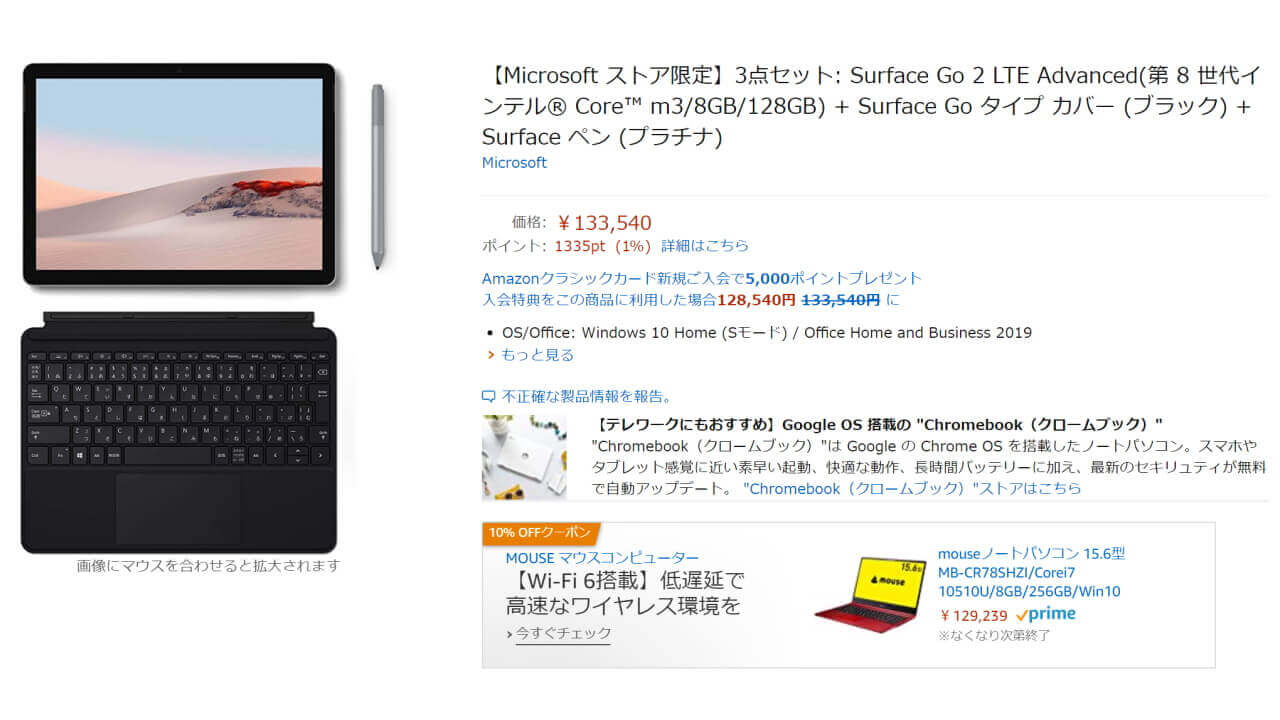 Amazon における「Surface Go 2」+ タイプカバーセットの価格は以下の通り。